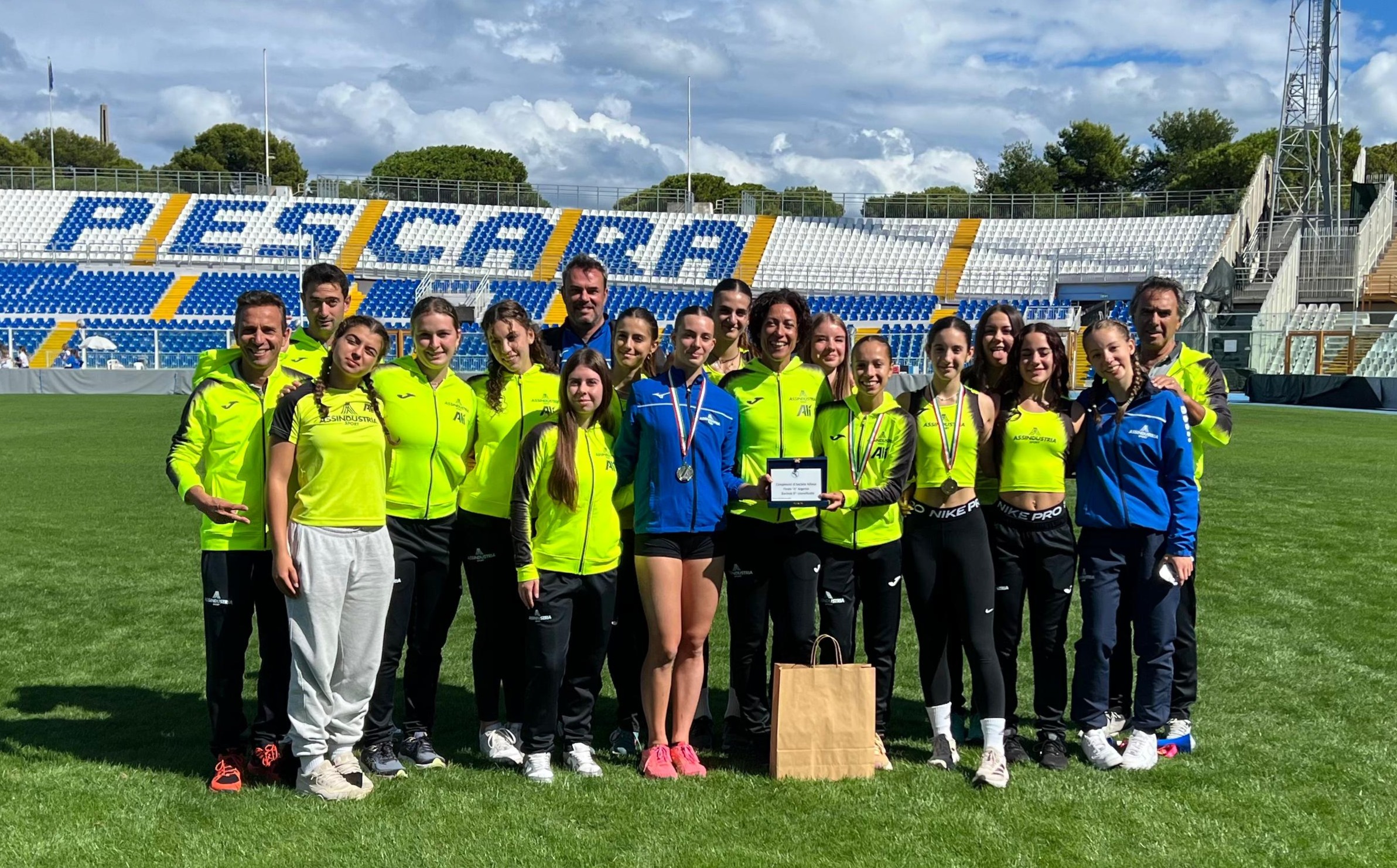 Un poker di medaglie. Dopo la Finale B Nord-Est dell’anno scorso, la squadra allieve di Assindustria Sport sale di livello e si mette alla prova a Pescara nella finale “A” Argento, terminandola al nono posto. Diversi i risultati di rilievo del team gialloblù, in Abruzzo seguito dai tecnici Ruggero Pertile, Michele Dianin e Chiara Arrigoni. Quattro, in particolare, le atlete capaci di salire sul podio, con i secondo posti di Chiara Calore nel martello e Giorgia Rampazzo nell’asta, e i terzi di Alice Pertile nei 3.000 e Giulia Pigozzo nel lungo. Una spedizione da cui la società torna con tante indicazioni interessanti, utili per il futuro.