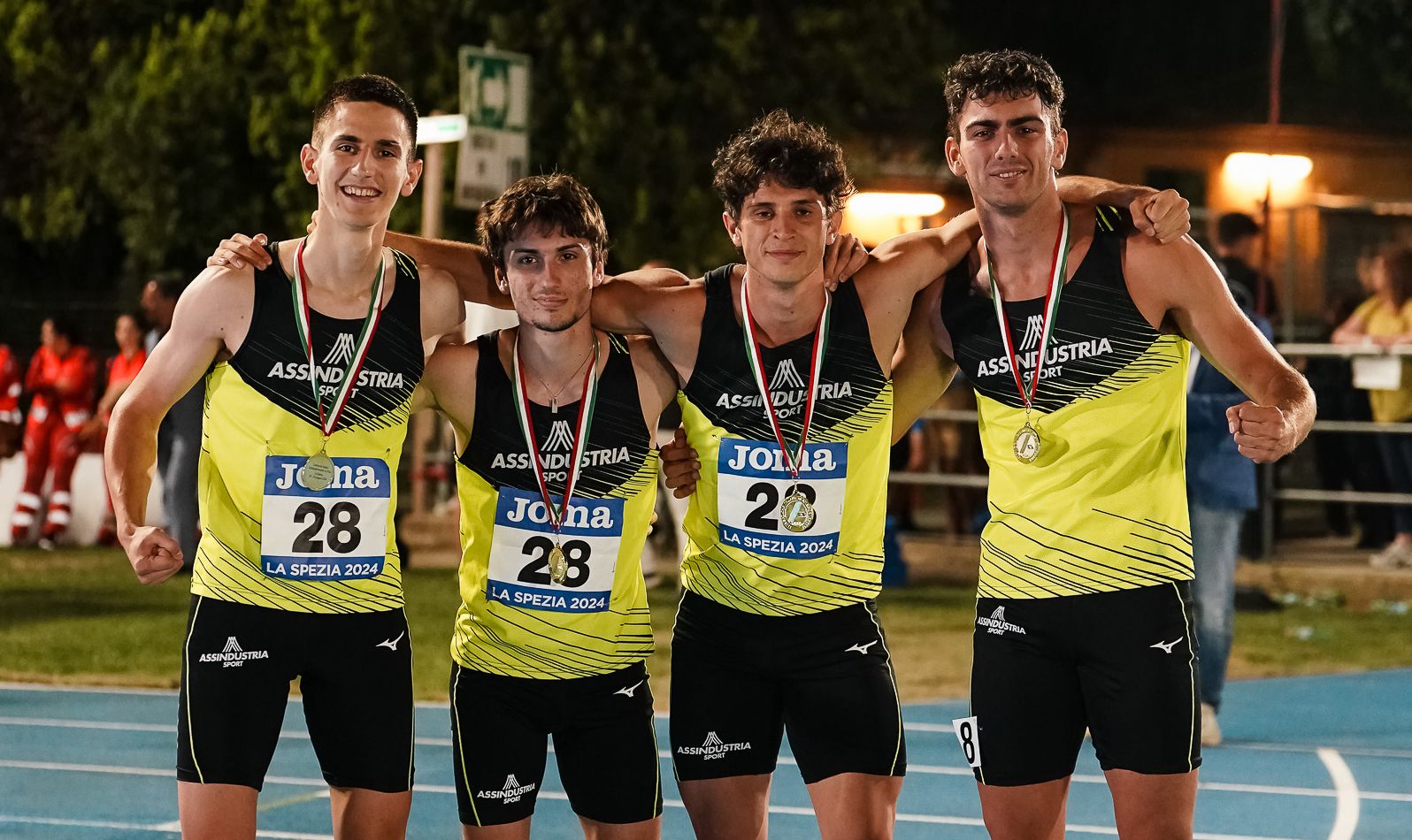 Dulcis in fundo. Sono le ore 22.54 di domenica 30 giugno quando sui blocchi si portano i frazionisti dell’ultima gara in programma in questa edizione numero 114 dei Campionati Italiani Assoluti di atletica leggera, a La Spezia. E proprio sul finale Assindustria Sport può esultare: Lorenzo Stoppato, Lorenzo De Bortoli, Luca Ostanello e Filippo Cibin bloccano il cronometro dopo 3’12”09 e, per un soffio, regolano Cus Pro Patria Milano (3’12”12) e Pro Sesto Atletica Cernusco (3’12”81), in una gara esaltante decisa al fotofinish. Subito scoppia irrefrenabile l’entusiasmo del quartetto gialloblù che, nel momento in cui più contava, fa registrare la sua miglior prestazione stagionale, tirando giù più di 7 decimi dal tempo che aveva firmato un paio di settimane prima al Challenge di Brescia, quando aveva ottenuto il pass per questi Tricolori. È oro!