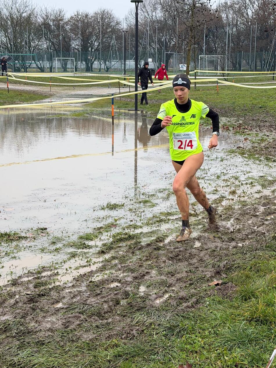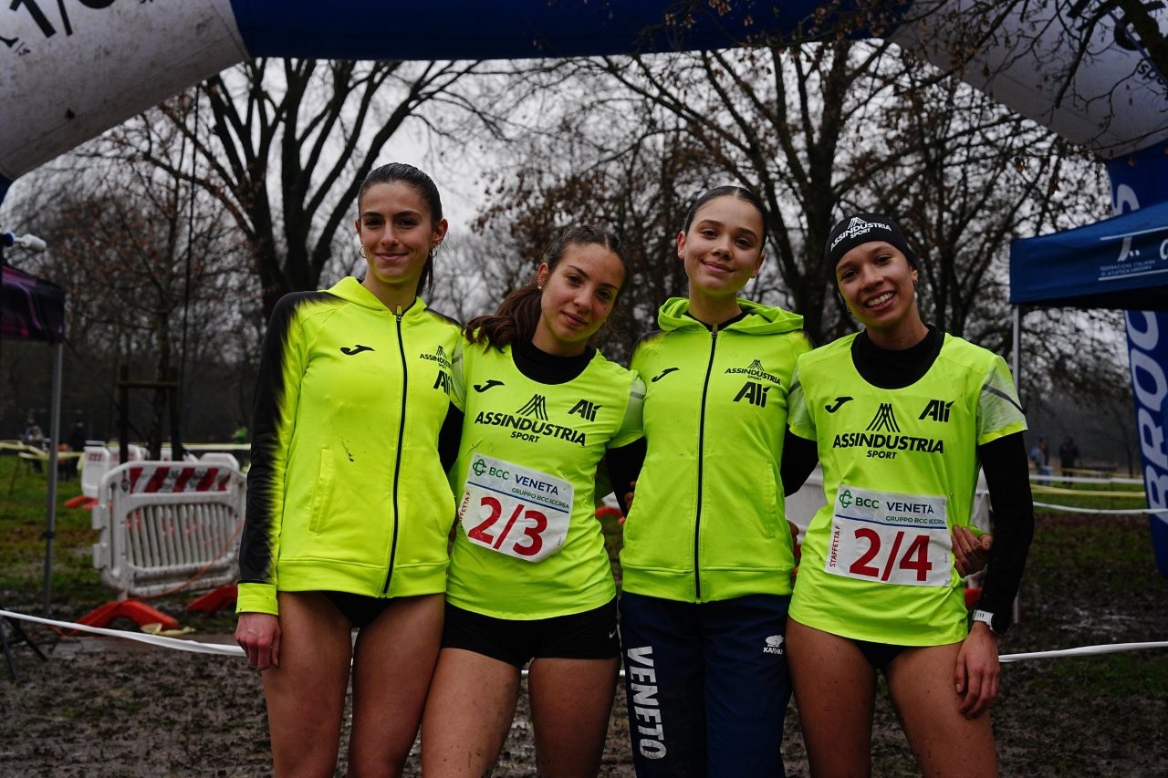 Al Parco degli Alpini, sotto una pioggia battente che ha trasformato il percorso in un autentico pantano, la staffetta femminile di Assindustria Sport ha conquistato il titolo regionale 4x2 km, al termine di una prova durissima, resa ancora più epica dalle condizioni proibitive del terreno. Camilla Cardin, Emma Prevedello, Veronica Pozzi e Alice Pertile hanno interpretato al meglio una gara di sacrificio e carattere, imponendosi in 32’00” e firmando una vittoria di grande spessore tecnico ed emotivo, coronata grazie a un’esaltante rimonta di Alice su Eleonora Lot (Atl. Ponzano), partita da ultima frazionista con un sensibile vantaggio ma raggiunta e superata. Nella stessa giornata, nel cross corto individuale maschile, Thomas Serafini ha chiuso al quinto posto regionale sui 3 km in 10’08”.