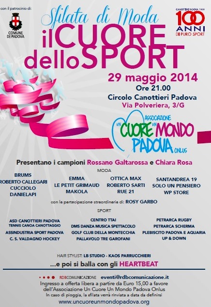 (Padova 28.05.14) Dalla pista alle passerelle. Gli atleti di Assindustria Sport Padova per una volta vestiranno i panni, per loro inconsueti di... modelli. Giovedì 29 maggio, dalle 21, sfileranno infatti al Circolo Canottieri di via Polveriera per “Il Cuore dello Sport”, serata di raccolta fondi per l’associazione “Un cuore un mondo Padova onlus”, che sostiene i reparti di cardiologia e cardiochirurgia pediatrica dell’Azienda ospedaliera-Università di Padova.