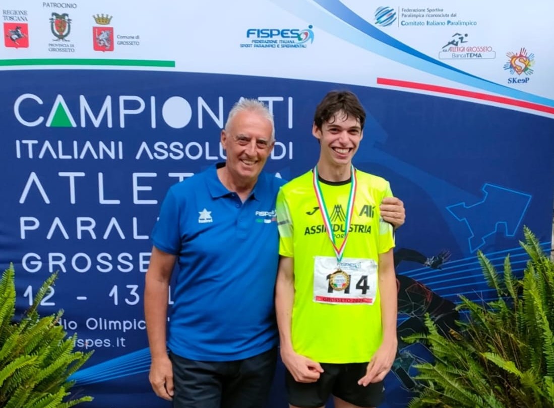 Due medaglie d’oro e un record italiano. È il bilancio, trionfale, di Gian Marco Ballin di ritorno dai Campionati Italiani Paralimpici di Grosseto. Habitué dei podi nazionali, lo sprinter di Assindustria Sport (nella foto sul podio col delegato regionale veneto Maurizio Menin) ha dato il suo meglio anche stavolta, firmando il nuovo primato tricolore nei 200 metri, categoria T38, in 27”26, dopo che a maggio aveva già riscritto quello dei 100 portandolo a 12”96. Stavolta corre la distanza più breve in 13”02 e fa comunque sua la gara, confermandosi sempre pronto negli appuntamenti che contano: per lui una doppietta da ricordare.