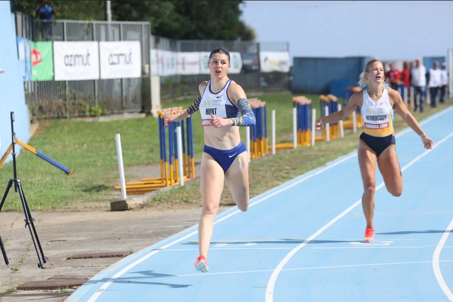 Nella foto (fonte: organizzatori) Amy Hunt prima sul traguardo dei 200 a Savona