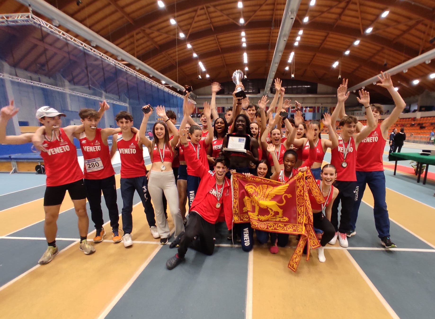 Il Veneto brilla ancora “Ai confini delle Marche”, con Lissi e Agostinis. La rappresentativa regionale cadetti si è imposta, per il secondo anno consecutivo, nella tradizionale rassegna andata in scena al PalaCasali di Ancona con la partecipazione di 13 selezioni regionali. Lo fa grazie anche alle tre medaglie portate a casa dagli atleti gialloblù convocati in rappresentativa: lo sprinter Lorenzo Lissi, terzo nei 200 in 23”53 e poi terzo anche con la staffetta 4x200, che ha tagliato il traguardo dopo 1’36”39; e l’ostacolista Tommaso Agostinis, a sua volta terzo nei 60hs, dopo aver tagliato il traguardo in 8”70. Il Veneto, nella classifica di squadra, ha preceduto l’Emilia-Romagna e il Lazio. Un risultato di spessore che lascia ben sperare in vista dell’inizio di un’annata estiva che, a livello under 16, culminerà a fine stagione con i campionati italiani individuali e per regioni di categoria, anche quest’anno in programma allo stadio Chiggiato di Caorle (5-6 ottobre).