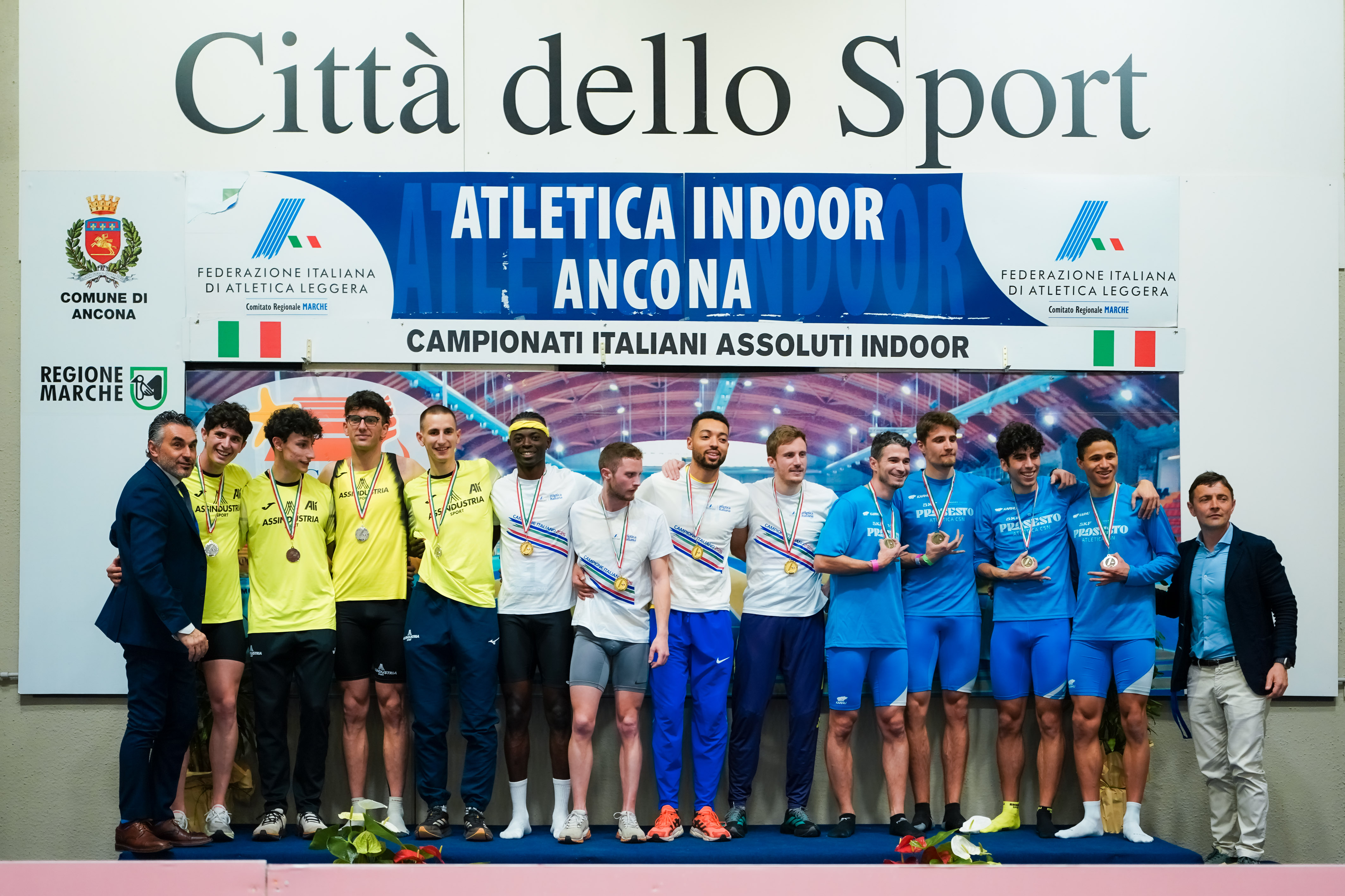 Ad Ancona, invece, sono stati cinque i finalisti della società. I riflettori hanno illuminato la staffetta 4x2 giri (foto sotto, Grana/Fidal), capace di salire sul secondo gradino del podio in 3’15”73 grazie a Jacopo Albertin, Lorenzo De Bortoli, Luca Ostanello e Filippo Cibin, gli stessi quattro che un anno fa avevano conquistato il bronzo. Il risultato è arrivato proprio in chiusura di una rassegna che ha visto Assindustria Sport confermarsi ai vertici anche nella classifica combinata indoor, dove il club ha chiuso terzo al maschile e quarto al femminile sommando i punteggi di Allievi, Juniores/Promesse e Assoluti. Nelle gare individuali, Thomas Serafini ha centrato un convincente sesto posto nei 3.000 in 8’04”23, mentre Thomas D’Este ha chiuso undicesimo in 8’25”18. Nei 60 ostacoli, Azzurra Ballin, fresca del titolo nazionale promesse conquistato sulla stessa pista, è stata sesta tra le “grandi” in 8”33 e Vittoria Masiero, già al bronzo poche settimane fa tra le juniores, diciottesima in 8”57. Nel lungo Sofia Borello ha sfiorato il podio con un quinto posto da 6.29 e nel triplo Francesca Ventura ha chiuso settima con 12.64. Tra gli uomini, Luca Corradin ha corso i 60 in 6”77 terminando 14°, 13° Fabio Tommasi nei 60 ostacoli con 8”18.