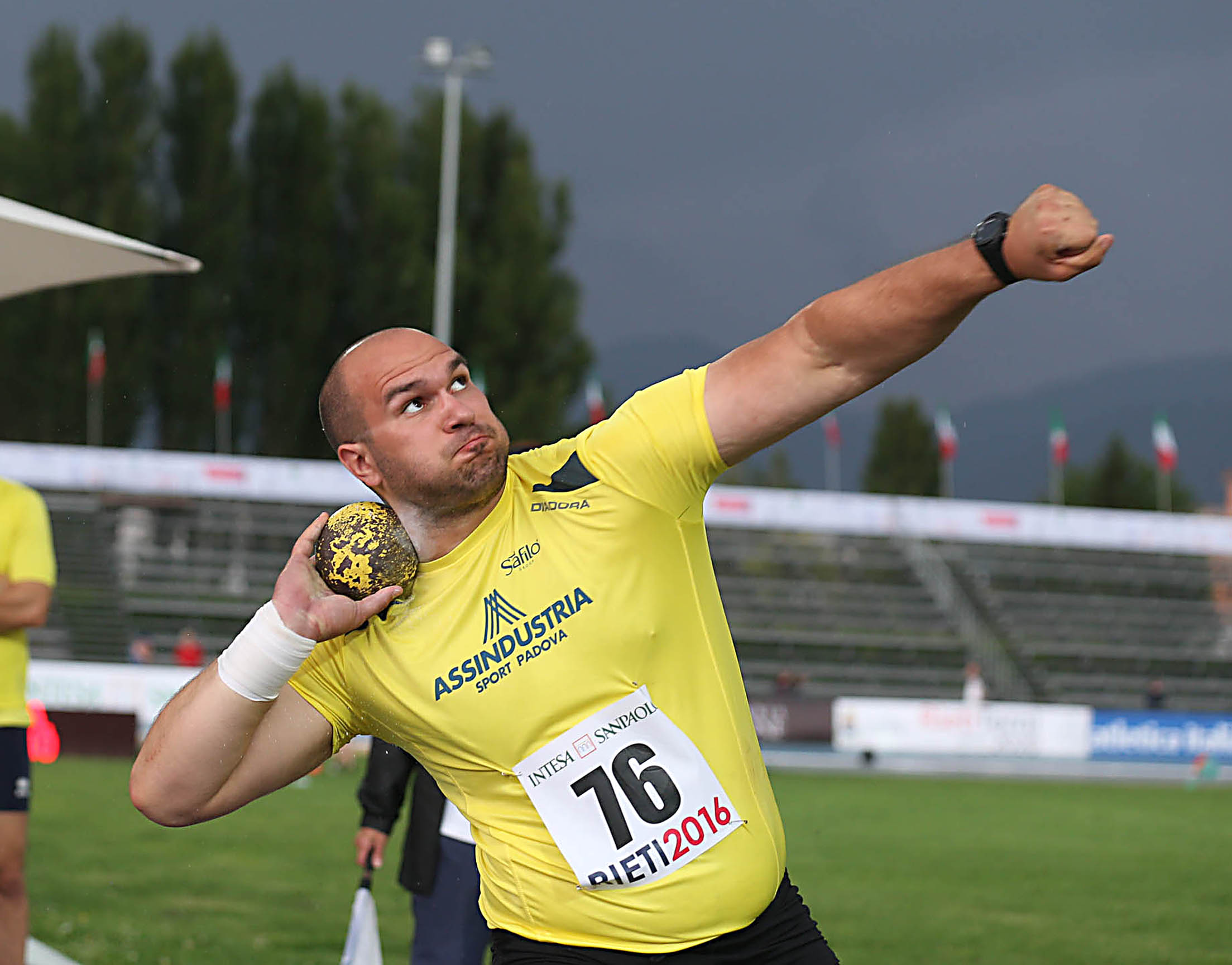 Ai campionati italiani assoluti di Rieti, il portacolori di Assindustria Sport Padova sale sul terzo gradino del podio nel getto del peso: «Questa pedana mi porta fortuna». Cortelazzo, Friso, Zangobbo e Zin: quante finali tinte di gialloblù!