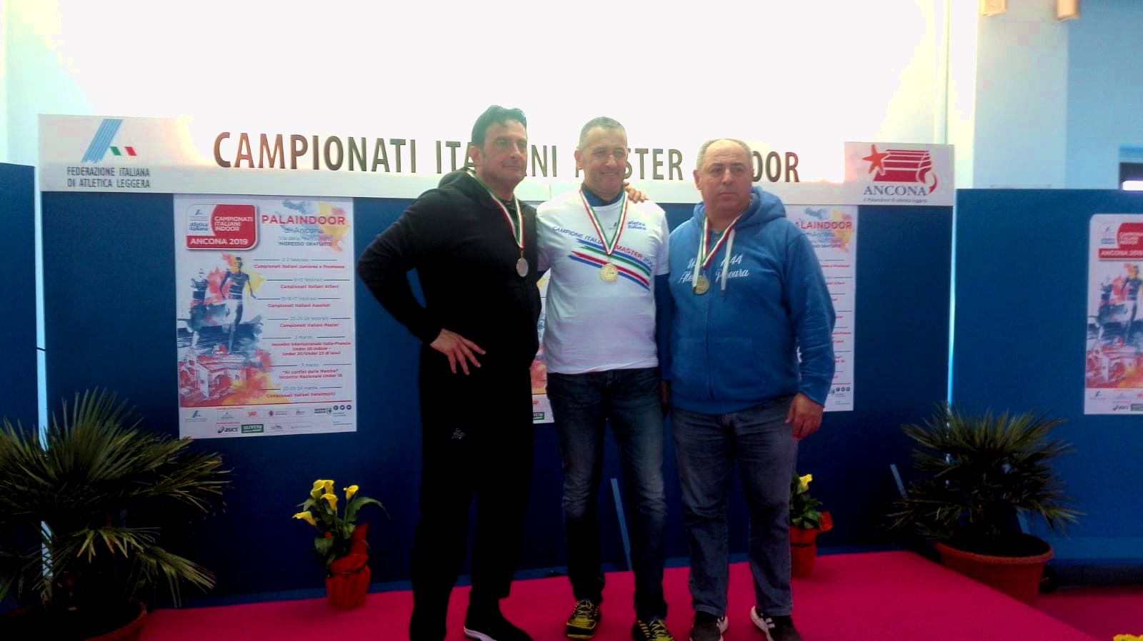 La tre giorni di gare ha coinvolto quasi 1400 iscritti e, tra loro, hanno ben figurato anche i portacolori di Assindustria Sport Padova. La società gialloblù torna infatti dai campionati italiani indoor Master di Ancona con due medaglie, quella d’oro conquistata da Federico Rampazzo nel peso (SM50) con 14.32 metri (nella foto al centro del podio) e quella di bronzo vinta da Katiuscia Marchetti (SF45) nel lungo con un salto da 4.82, mentre Paolo Benetollo (SM55) ha sfiorato il podio, classificandosi quarto nell’asta a quota 3 metri.