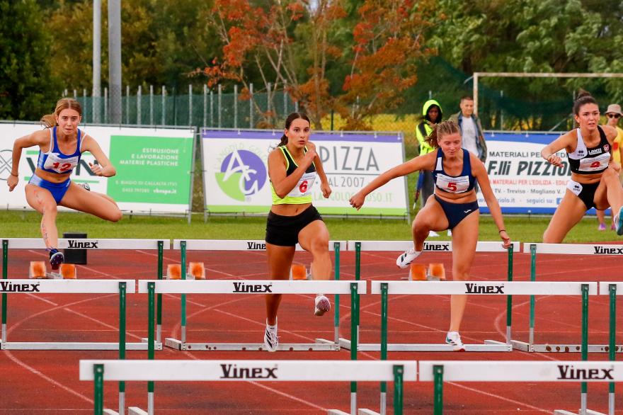 ALLIEVE. 100: 3. Giulia Rizzuto 13”23 (-1.9). 200: 8. Rizzuto 27”66 (-1.3). 400: 9. Emma Matteazzi 1’08”33. 100hs: 1. Vittoria Masiero 14”33. 400hs: 1. Masiero 1’04”46. Lungo: 3. Giulia Pigozzo 5.07 (+0.2). Triplo: 3. Matteazzi 10.73 (+1.9). Alto: 3. Nurah Mandy Fadika 1.55. Asta: 2. Elena Moressa 3.10. Peso: 7. Eria Passone 8.89. Disco: 1. Giulia Toniolo 31.49. Martello: 4. Francesca Bonesso 39.97. Giavellotto: 9. Toniolo 20.31. 4x100: 1. Assindustria Sport (Pigozzo, Rizzuto, Valentina But, Masiero) 51”06.