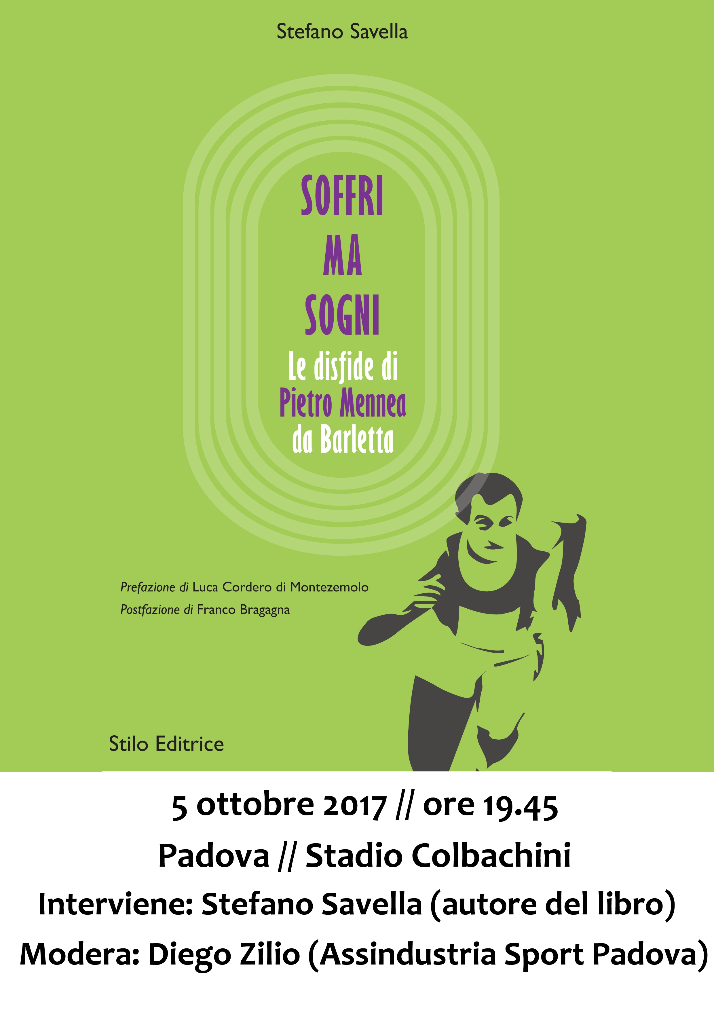 Allo stadio si può parlare anche di libri. Giovedì 5 ottobre, alle ore 19,45 lo Stadio Colbachini di Padova ospiterà la presentazione volume “Soffri ma sogni. Le disfide di Pietro Mennea da Barletta”, di Stefano Savella, aperta a tutti.