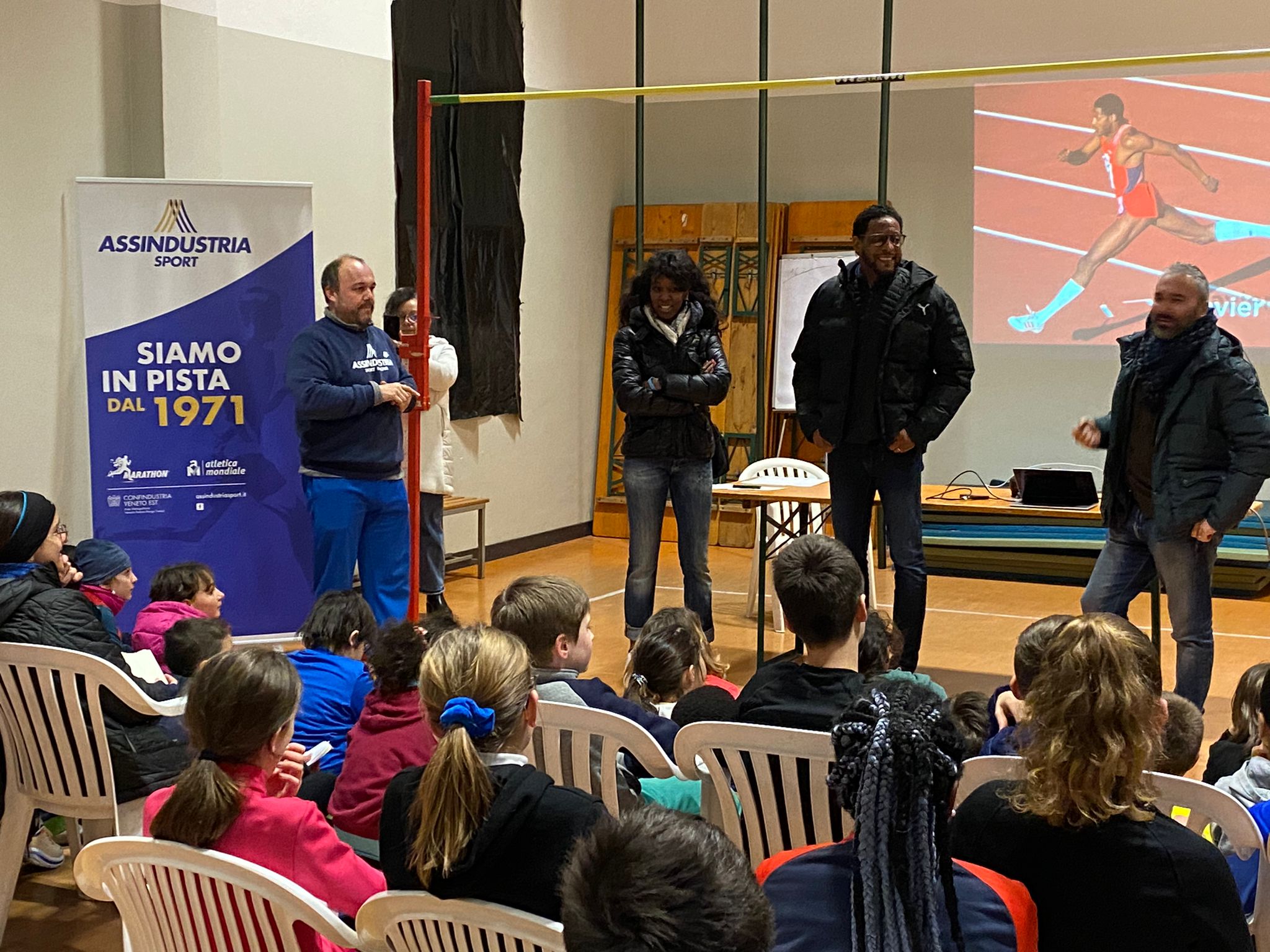 Un campione tra i baby talenti di Assindustria Sport. Graditissima visita del primatista mondiale del salto in alto Javier Sotomayor allo Stadio Colbachini, il campione olimpico cubano, affiancato da Magdelin Martinez, tecnico del club qui nelle vesti di simpatica traduttrice, si è raccontato di fronte a un centinaio di ragazzi del club.