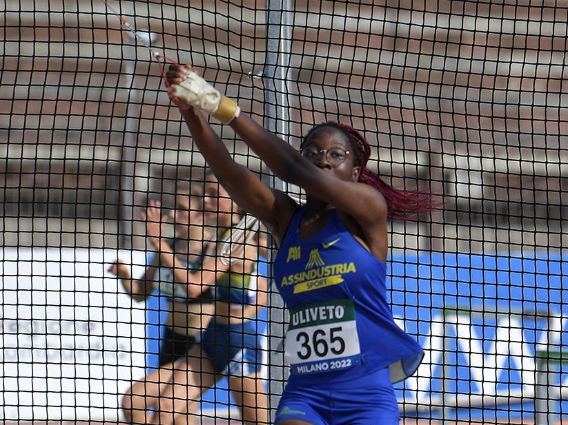 Dopo le promesse, gli allievi. Under 18 protagonisti nel weekend di Assindustria Sport, come sempre ricchissimo di impegni ma con i riflettori puntati sui Campionati italiani allievi, di scena nell’Arena civica Gianni Brera di Milano. Tre le medaglie portate a casa dalla squadra gialloblù, che conquista due argenti e un bronzo. Il primo argento lo infila in bacheca Keren Mbongo (nella foto Grana/Fidal), seconda nel lancio del martello con 54.74 metri e curiosamente davanti alla sorella gemella, nonché compagna di maglia, Ketsia, quinta con 51.09. Il secondo va invece al collo di Filippo Rodeghiero, che chiude a 2 metri nel salto in alto, unico atleta che per un po’ riesce a tener testa al reatino Mattia Furlani, dal canto suo capace di imporsi con la miglior misura mondiale dell’anno nella categoria, volando a 2.16. Assindustria Sport manda però sul podio anche una terza atleta, l’ostacolista Martina Agostini, che porta a casa la medaglia di bronzo nei 100hs, tagliando il traguardo in 14”03. Da citare anche le finali raggiunte dalla sorella gemella Stella Agostini nel lungo e dalla staffetta 4x100 femminile, e i personali migliorati da Emmanuele Camporese nei 400hs e Pietro Galati nei 2.000 siepi.