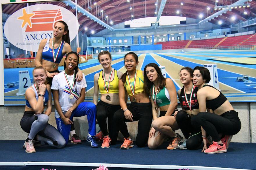 Sprint da primato personale. I campionati italiani allievi indoor di Ancona hanno salutato i progressi di Hope Esekheigbe, quinta nei 60 metri piani in 7”79 (ma in batteria aveva fatto ancora meglio: 7”76), e di Ilenia Carraro, che ha ottenuto lo stesso piazzamento nei 200 in 25”11. Le due atlete, seguite rispettivamente dai tecnici Olivieri e Agostini, hanno ottenuto i risultati più positivi per i colori di Assindustria Sport in questa rassegna dei Tricolori, assieme alla lunghista Laura Moro, ottava in pedana (nella foto assieme alle altre finaliste è la prima da destra, fonte FotoGp.it) dopo aver lasciato il segno sulla sabbia a 5.40 metri. Particolarmente sfortunate le ragazze della 4x1 giro, che avrebbero potuto raccogliere un risultato migliore senza una caduta, che ha compromesso la loro prestazione.