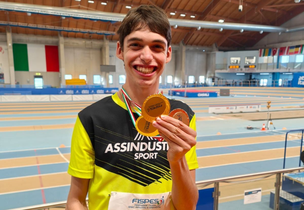 Assindustria Sport è sempre sul podio. Il terzo fine settimana di gare, in chiave gialloblù ha un protagonista assoluto. È l’inarrestabile Gianmarco Ballin, che torna dai Campionati italiani paralimpici di Ancona con al collo tre splendide medaglie d’oro, ancora più luccicanti perché impreziosite da altrettanti record nazionali nella sua categoria, la T38. Per lo sprinter, allievo di Michele Dianin al Colbachini, c’è subito la vittoria nei 60 piani: dieci giorni dopo aver stabilito il nuovo record nazionale T38, lo abbassa ulteriormente coprendo la distanza in 8”14. Nello stesso primo giorno di gare il bis con l’affermazione sui 400 in 1’02”21, soffiando il primato di categoria a Marco Desiato (era 1’03”44). Ma non è mica tutto, perché nel secondo giorno di gare ecco che ha calato il tris, imponendosi nei 200 in 26”82 e ritoccando nuovamente il riferimento T38 che lui stesso aveva stabilito appena due settimane fa a Padova. Non c’è che dire, Ballin i complimenti se li merita tutti.